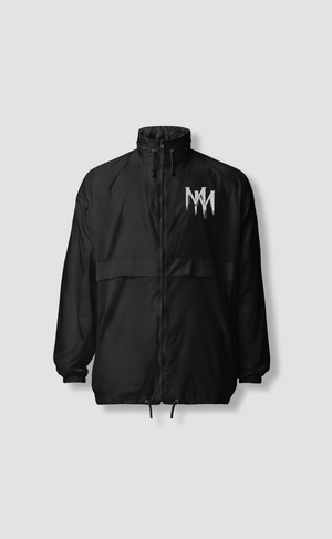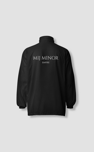 The Black MIJ Windbreaker features the sign of the MIJ MINOR Melting Logo on the Front and the MIJ MINOR Empire Logo on the back - Embroidery Print.