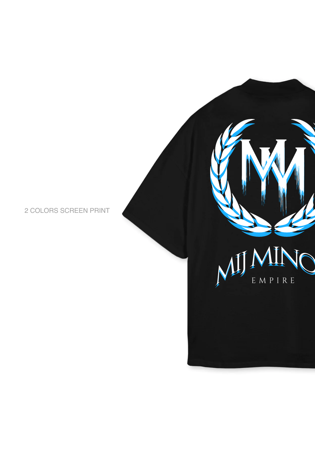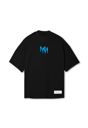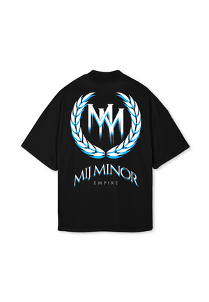 The black cotton T-shirt features the sign of the MIJ MINOR Melting Logo on the Front and the MIJ MINOR Merc Logo on the back - Direct to Garment Print.