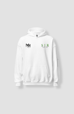 White MIJ x SIR Hoodie features the sign of the Big SIR Logo on the Back and the Small MIJ MINOR Melting x SIR Logo on the Front.
